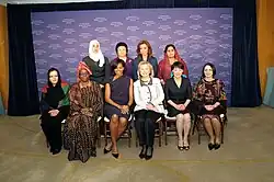 Ágnes Osztolykán (sitting in the first row on the right end) poses on the 2011 Women of Courage Award ceremony, March 8, 2011. Back row standing, left-to-right: Eva Abu Halaweh of Jordan, Roza Otunbayeva of Kyrgyzstan, Marisela Morales Ibañez of Mexico, Ghulam Sughra of Pakistan. Front row seated, left-to-right: Maria Bashir of Afghanistan, Henriette Ekwe Ebongo of Cameroon, Michelle Obama, Hillary Clinton, Jianmei Guo of China