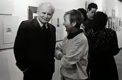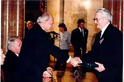 After his presidency, Göncz completely retired from politics and resided in a state residence at Béla király Street along with his wife until his death in October 2015.[131] In September 2000, he was appointed President of the Hungary in Europe Foundation which awarded literary prizes annually.[132] He gave a speech on 23 October 2000, where he told "the proliferating phrases during annual commemorations had overshadowed the actual events of the 1956 revolution."[133] In November 2000, Göncz became an honorary citizen of Budapest, awarded by the city's Mayor and fellow SZDSZ member Gábor Demszky.[134] In December 2000, a prize was founded by the United States, named after Göncz. U.S. Secretary of State Madeleine Albright awarded the Göncz Prize to Erika Csovcsics, headmistress of the Gandhi School for the first time.[135]