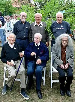 Tibor Méray, Árpád Göncz, Miklós Jancsó (back row), Ferenc Fejtő, Domokos Kosáry and György Faludy (front row) at the 2003 Szárszó meeting
