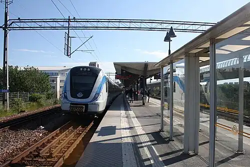 Årstaberg is a station on Stockholm's commuter rail network, situated in the on the border between the Liljeholmen and Årsta districts in the south of Stockholm Municipality. The station has a central platform with two tracks serving commuter trains, along with additional tracks for passing trains that do not stop at the station. Årstaberg Station also features a stop on the Tvärbanan light rail line.[2]