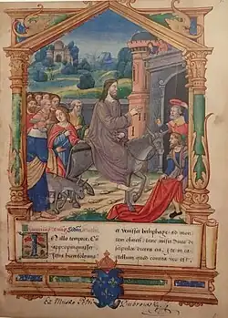 The "Master of the Puys de Rouen" (loosely, "... of the Hills of Rouen") was engaged for several projects by Étienne Colaud, notably on the so-called "Rouen Manuscript", the work for which he was the principal illustrator, and from which he acquires the name by which he is generally known by scholars.[11] He was active in Paris between 1520 and 1540. His style is characterised by exaggeratedly square-jawed figures, firm outlines and voluminous architectural framing. In addition to the works he produced for Colaud, several other significant manuscripts are attributed to him, including an Evangelion for the Duprat family, a Book of Hours which recently appeared on the London art market through a dealer called Sam Fogg,[10] and another Book of Hours sold by the specialist dealer "Les Enluminures" in 2008. The German art historian Eberhard König has suggested this last work might be attributed to Henri Laurer, an artist from Paris who moved to Mirepoix (far away, south of Toulouse) but the attribution was not endorsed by other specialist scholars.[1]
