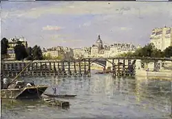 In the 1770s another wooden groyne (‘estacade’) was constructed at the upstream end of the reach separating the Île Louviers from the Île Saint-Louis, allowing it to be used as a dock and protecting it from winter ice.[20] In 1843 a footbridge was added to this structure and it became known as the fr:Passerelle de l'Estacade.[18][21] The footbridge remained after the île Louviers ceased to be an island, and was not demolished until 1932.[22]