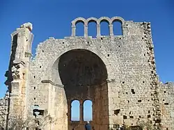 The house ruins in the north of the site are examples of the polygonal and Byzantine masonry. One house is a peristyle house. The foundations of some buildings are carved rock. There are sarcophagi along the road. At the center of the site there are ruins of a basilica. The basilica with three naves and a transept is backdated to about 500. There is a smaller church situated about 500 metres (1,600 ft) south of the basilica.[2]