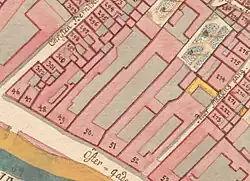 The property was home to 42 residents in seven households at the 1850 census. Moses Magnus Ruben resided on the ground floor with his wife Hanne Ruben, their five children (aged four to 17), his 15-year-old apprentice Julius Wolff, one male servant and two maids.[11] Franz Emilius Martins, a grocer (høker), resided in the building with his wife Johanne Henriette Schou, their three children (aged two to five) and two maids.[12] I. D. Schwiening, a shoemaker, resided in the building with his wife Laurentze Vilhelmine Schwiening (née Damm), their nine-year-old daughter, an apprentice and two maids.[13] Johan Martin Scheuerlein, a smith (smedesvend), resided in the building with his wife Christiane Scheuerlein, their three children (aged one to 10) and one maid.[14] Johan Peter Lund, a master saddler, resided in the building with two apprentices.[15] Christian Nielsen, a horse driver (hesteudkører), resided in the rear wing with his wife Benthe Nielsen (née Olesen) and their two sons.[16] Emil Frederik Gynther Lorenzen, a young silk and textile merchant, resided in the cross wing (mellembygningen) with his sister Hansine Petrine Valeria Lorenzen, two apprentices and one maid.[17]
