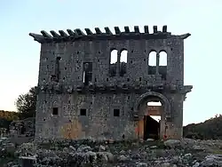 The ruins are composed of two houses and a cistern. The big house is a two or three-storey building with balconies and wide windows on the second floor.[1] The building was a villa rustica during the Byzantine Empire period. The stone walls, interior coving and blind vaults as well as corbels to support the balconies survive. But the ceiling and floor structures which were wooden have been demolished. There is a wide downspout which leads the rain water to a cistern at the back of the house. (In the Mediterranean area such cisterns were common during the Roman times). One of the balconies was a toilet room with sewage drain. There is also a smaller house at the back which was probably a service building of the villa.