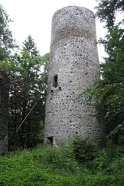 A tourist destination is the ruin of the Volfštejn Castle, located in the woods at the foot of Vlčí hora. It was built in the middle of the 13th century, the first written mention dates from 1316. It was destroyed during the battles of King George of Poděbrady with the opposition in 1470. The best-preserved part is the bergfried with a Romanesque arched portal. Today the ruin is freely accessible.[7]
