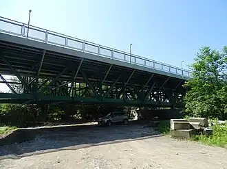 46°6′2.21″N 14°31′8.67″E / 46.1006139°N 14.5190750°E / 46.1006139; 14.5190750 The Črnuče Road Bridge (Slovene: Črnuški cestni most) is a road bridge crossing the Sava River in Črnuče, a district of Ljubljana, the capital of Slovenia. The bridge, which dates to 1906, is 143 metres (469 ft) long. It forms part of the Vienna Road (Dunajska cesta), a main road artery of Ljubljana, and is used by local bus lines Nos. 6, 8, and 21.[2] The bridge was for the last time renovated in 2014.[3] Downstream of the road bridge runs the Črnuče Railway Bridge (Slovene: Črnuški železniški most) with a metal framed structure. Its construction took place as part of the project to connect by railway the towns of Ljubljana and Kamnik, and it was completed in 1891. This bridge was demolished in 1945, during World War II, but was then rebuilt.[4]