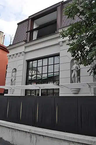 In the house he used to live in there was also his studio, 6m x 6m, with one glass wall which enabled the light penetration necessary for his creative work. Specially designed niches intended for placing the sculptures on the front facade showed that a sculptor lived in that house, there was one female sculpture which symbolizes painting, and the male one symbolizes the sculpture. The basic residential area was on the ground floor, and consisted of four rooms with a bathroom and the stairway. The artistic studio, in which there was a great number of art works, models, plaques and sketches, had a dominant position in the house.[3]