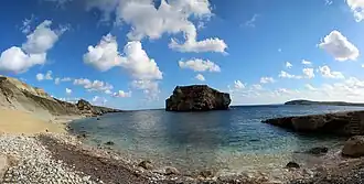 Panorama of Ħalfa Rock from the nearby beach.