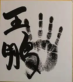 His promotion to sekitori status saw him adopt the shikona 'Ōhō (王鵬).[13] Ōtake (former jūryō wrestler Dairyū), Ōhō's stablemaster, commented that he had considered giving Ōhō the shikona Taihō (大鵬) but could not because Taihō was also the name of a non-transferable elder share (ichidai toshiyori) within the Sumo Association.[14] He therefore replaced the character Dai (大) with Ō (王) as a bit of wordplay to evoke the memory of Taihō and the solid mentality of Ōhō.[13] The character Ō (王) can be pronounced the same as the character Dai (大) which is commonly used by wrestlers of Ōtake stable in deference to both the founder's (Taihō) and the current stablemaster's (Dairyū) shikona. The character Hō (鵬) is taken directly from Taihō's shikona.[15]