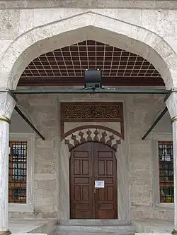 The mausoleum is attached to the prayer hall. It is entered from the outside from northwest, but opens into the prayer hall with a grilled archway. The chamber is crowned by a mirror vault at the height of the prayer hall drum. It has three casement windows facing the Bosphorus and nine upper windows on three walls, adorned with colored glass. Decoration is limited to the stalactite carvings of the portal and painted floral and geometrical motifs on the mirror vault. Although its portal inscription was lost, inscriptive plaques over the archway in the prayer hall were preserved. The tomb, like the mosque and the complex, are made of cut stone. The L-shaped madrasa has twelve domed cells and a large classroom, all fronted by an arcade whose shed roof is carried by nineteen columns. Cells are placed all in a row except at the northern end, where a single cell encloses the arcade before the seawall. The classroom, which is seven meters squared, occupies the centre of the western wing of and projects beyond the madrasa wall. It is surmounted by a dome carried on squinches and raised on an octagonal drum. There are six windows on three of the classroom's walls, leaving the western wall for a furnace and two shelving niches. Each madrasa cell has two windows, a furnace and one or two shelving niches. The arcade was enlarged following the restoration and the madrasa was refurnished to house a Library in 1953 with the classroom use as the reading room. An additional room with privy cells is attached at the end of the southern wing.