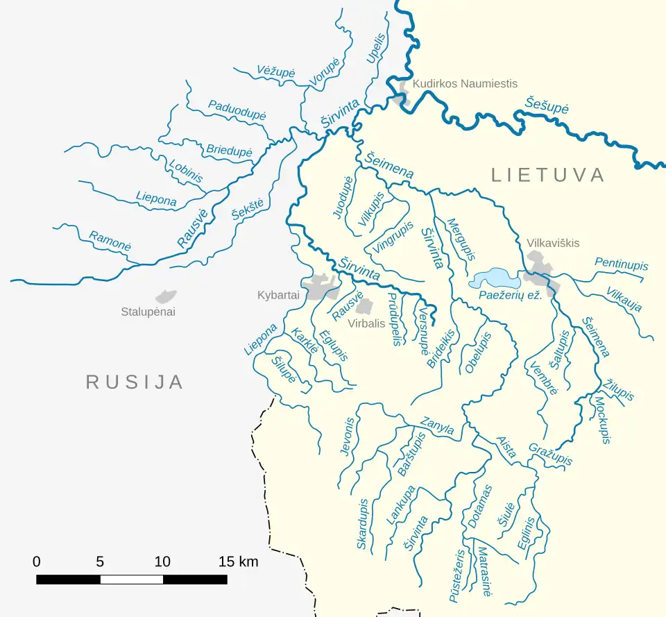 It begins in Vilkaviškis District Municipality, west of the village of Alvitas, and flows northwest in its upper reaches. From the confluence with the Liepona, the river flows north, then northeast, forming about 20 kilometres (12 mi) of the Lithuania–Russia border. The river then passes the Širvinta bridge built by the Germans in Kudirkos Naumiestis, and flows into the Šešupė, at a total length of 43.8 km (27.2 mi).