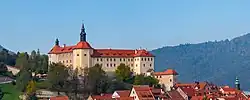 Škofja Loka lies at an elevation of 354 meters (1,161 ft)[4] at the confluence of the Poljane Sora and the Selca Sora rivers, at the transition of the Sora Plain into the Škofja Loka Hills and the Polhov Gradec Hills. Its old center stands on river terraces, and comprises Town Square (Plac) and Lower Square (Lontrg). On a plateau above the town stands Loka Castle, which houses the Loka Museum.[5] Above the castle rises Krancelj Hill (475 meters or 1,558 feet). North of the town center is Kamnitnik Hill (414 meters or 1,358 feet high), known for its conglomerate rock.[6] Immediately south of the town is a plain known as Viršk or Viršk Plain (Slovene: Virško polje), which the Poljane Sora flows through before joining the Selca Sora. The name Viršk is a corruption of German Hirsacker 'millet field', named for the millet that was grown there in the past.[7]
