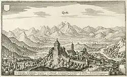 Škofja Loka was occupied by Italian forces on 13 April 1941. The Italian authorities were replaced by German authorities on 17 April. The first citizens of the town were arrested by the Gestapo on 6 May 1941 and in the following weeks 26 families were deported to Serbia. Partisan units were active in the area throughout the war. On 9 February 1944, German forces shot 50 hostages in revenge for the killing of a German soldier. The Partisans entered the town on 9 May 1945.[9] After the war, Loka Castle was used to hold prisoners of war and political prisoners.[10][11][12]
