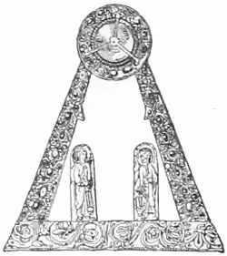 The 'A' of Charlemagne is an open triangle made of wood that is varnished with silver-gilt. At the peak of the triangle is a circular piece that houses a large, polished gem on the frontal side. Below the gem sit two angels made by repoussé metal working. Both angels glance upwards toward the gem, and one angel holds an object perceived to be a lamp. The rear side of the gem is molded in a similar fashion to the angels.[1] In the early 1950s, Jean Taralon disassembled the piece for cleaning purposes and made many discoveries about the history of the work. The wood was determined to be walnut but various sections of the "A" dated to two distinctly different time periods. He determined the base and gem to be much older, and, therefore, the arms of the piece were considered replacements on which the gems were carefully replaced.[1]