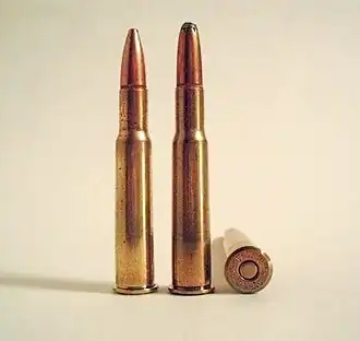 Though the U.S. Navy and Marine Corps had adopted limited numbers of smokeless powder and bolt-action rifles, the .30-40 was the first cartridge adopted by the US Army that was designed from the outset for smokeless powder. It was patterned after .303 British, to which it is very similar geometrically.[7] After a brief experiment with a 230-grain bullet loading, the .30 Army loading was standardized in 1894 using a 220-grain (14 g) metal-jacketed round-nose bullet with 40 gr (2.6 g) of nitrocellulose powder. This loading developed a maximum velocity of 2,000 ft/s (610 m/s) in the 30-inch (760 mm) barrel of the Krag rifle,[8] and 1,960 ft/s (600 m/s) in the 22-inch (560 mm) barrel of the Krag carbine.