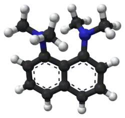 1,8-Bis(dimethylamino)naphthalene is an organic compound with the formula C10H6(NMe2)2 (Me = methyl). It is classified as a peri-naphthalene, i.e. a 1,8-disubstituted derivative of naphthalene. Owing to its unusual structure, it exhibits exceptional basicity. It is often referred by the trade name Proton Sponge, a trademark of Sigma-Aldrich.[3]