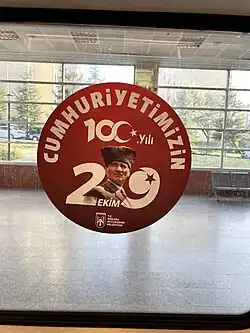 For the 100th year, the Istanbul Metropolitan Municipality chose the slogan "Century of Democracy".[65] Atatürk posters and Turkish flags were hung in metro stations and various municipal buildings. Atatürk's statement "The republic is the greatest celebration!" during the proclamation of the republic was frequently played on the metro. On the day of the celebration, Metro Istanbul services were free,[66] and the municipality organized a special celebration in Maltepe.[67]