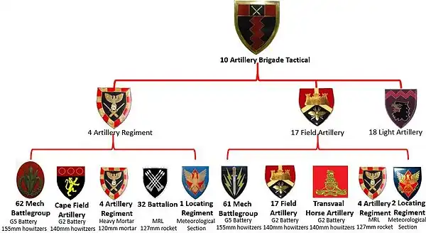 10 Artillery Brigade[6] Tactical headquarters was an artillery formation created in 1988 to support the ad hoc formation of 10 SA Division which had been formed to counter the Cuban threat in south-western Angola in June 1988. It was composed of: