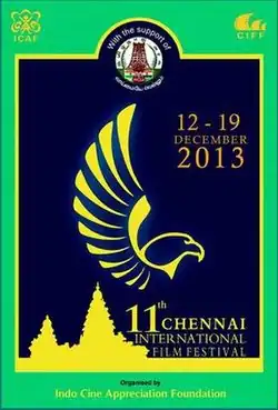 The Chennai International Film Festival (CIFF) was instituted in the year 2003 by the Indo Cine Appreciation Foundation (ICAF), a non-profit organisation.[1] ICAF is a registered film society and works for the promotion of meaningful cinema by organising country centric festivals throughout the year by obtaining films from Embassies and Consulates, and has around 500 members, including film directors, cinematographers and technicians.[2] In 2008, the Government of Tamil Nadu began supporting the event by sponsoring a part of it. The fest was reinvented in 2010 following the involvement of actor-director Suhasini which spiraled the direct involvement of film personalities in coordinating the fest. Later, when the funds raised through well-wishers were not substantial enough to support the event, the state government extended its support and financed the fest with a donation of 5 million (US$59,000). Since then, the government has been supporting the subsequent editions of the festival.[1] The fest is conducted every year during the month of December.[3]