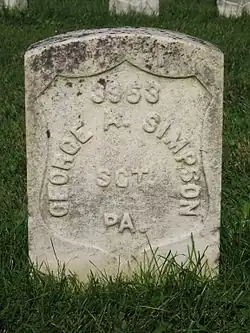 The 125th Pennsylvania Volunteer Infantry Monument on the Antietam Battlefield was dedicated on September 17, 1904, and is located on Confederate Avenue behind (West) of the Dunker Church.[27] During the 125th Pennsylvania's withdrawal from the indicated position in the West Woods, one of the most dramatic events in the regiment's history began with the regimental color-bearer, Sergeant George Simpson who stands immortalized in granite on top of the monument: