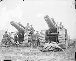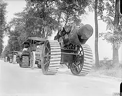 8-inch Mk V howitzers of 135th Siege Bty being towed along the Amiens–Albert road by Holt caterpillar tractors.