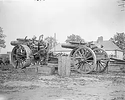 The battery left Cullercoats on 4 June to join R Siege Brigade (Training) at Horsham and after a month moved to Lydd to complete its training, first with B Bde, then with C Bde. On 29 July the battery began to move to Bristol to mobilise, where its guns were waiting. The battery was equipped with four 8-inch howitzers.[5][6] At this stage of the war the 8-inch howitzers in use (Marks I–V) were improvised from cut-down and bored-out barrels of 6-inch coast defence guns, with the recoil checked by enormous wooden wedges.[7][8]