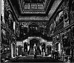 From the front door there was a small entrance hall, with a library and dining room either side.[3] The entrance hall led to the saloon, at the centre of the house, which was two storeys high and topped by a skylight incorporating "embossed and coloured glass" featuring "shields, coats of arms, mottoes and monograms".[3] The saloon originally contained a stone staircase which was replaced with a double oak one in 1924.[3] Also in 1924, the saloon was redecorated in oak panelling, and cantilevered landings added around three sides of the second storey of the room.[3] The saloon was flanked by a serving room (adjacent to the dining room), a dressing room, the second (servants') staircase, and a waiting room.[3]