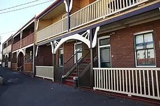 These large terraces feature elaborate timber verandahs with ornamental brackets in the Federation style. Also, they have terracotta Marsailles roofs. The terrace consists of a two bedroom units on both the ground floor and the first floor. The stairs leading to the upper units are generally shared by two units, with the entry to the lower units directly to the sides of them. Storeys: Two; Construction: Facebrick walls, tiled roof, timber verandah and balustrading. Style: Federation.[1]