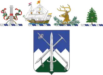 Per fess dancetty of four Azure and Argent issuant in base a mount Vert and overall in bend a ski pole crossed by an ice axe in bend sinister, in pale overall a sword point up of the second.