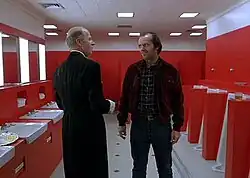 In professional productions, the applied 180-degree rule is an essential element for a style of film editing called continuity editing. The rule is not always obeyed. Sometimes a filmmaker purposely breaks the line of action to create disorientation. Carl Theodor Dreyer did this in The Passion of Joan of Arc; Stanley Kubrick also did this, for example, in the bathroom scene in The Shining.[4] Directors Jacques Demy, Tinto Brass, Yasujirō Ozu, Wong Kar-wai, and Jacques Tati have also ignored this rule sometimes,[5] as has Lars von Trier in Antichrist.[6] In the seminal French New Wave film À bout de souffle (Breathless), Jean-Luc Godard breaks the rule in the first five minutes in a car scene which jumps between the front and back seats, improvising an "aesthetic rebellion" for which the New Wave would become known.[7] When the rule is broken accidentally, or for a technical reason (such as the inability to place a camera physically in the correct position), there are techniques which may be employed to attempt to hide it. For example, the editor may pre-lap a word or two of dialog prior to the cut, so that the viewer will concentrate on what is being said as a distraction from the breaking of cinematic convention.