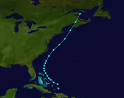 Although the steamer Antonio Lopez may have encountered this storm as early as September 11, a track could not be constructed as far back as that date because the location of the ship was not logged.[15] Instead, the Atlantic hurricane database (HURDAT) initiates the track as a Category 1 hurricane about 900 mi (1,450 km) northeast of the Lesser Antilles on September 16.[3] Reports from the ship Harley John and an unnamed vessel indicated the cyclone possessed sustained winds of 80 mph (130 km/h).[10][3] The hurricane moved generally northwestward for a few days until turning northward on September 20. Curving northeastward on the following day, the cyclone weakened to a tropical storm on September 22 before being last noted several hours later just offshore Newfoundland's Burin Peninsula.[3]