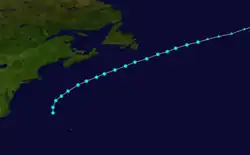 The bark J.E. Fisher first encountered this storm on September 18,[23] leading the Atlantic hurricane database to begin the track about 270 mi (435 km) northwest of Bermuda. After initially trekking to the northwest, the storm curved to northeastward and moved in that direction for the remainder of its duration.[5] According to ship records,[6] the system likely remained just below hurricane intensity, with winds reaching 70 mph (110 km/h) on September 19. It weakened over the north Atlantic, becoming extratropical on September 22 about 575 mi (925 km) east of Newfoundland and fully dissipating by September 24.[5] Chenoweth did not propose significant changes to this storm's track or duration, but started it as a hurricane, which peaked with winds of 90 mph (150 km/h). On September 21, the cyclone weakened to a tropical storm.[7]
