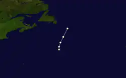 The brig Belle of the Bay encountered a severe gale north of the Bahamas on September 24.[25] Consequently, the track listed in HURDAT begins that day as a tropical storm approximately 275 mi (445 km) east of Jacksonville, Florida. The storm moved slowly northeastward and intensified into a hurricane with maximum sustained winds of 80 mph (130 km/h) on September 25,[7] based on reports from the ships R.A. Allen and Sedmi Dubrovacki.[4] By September 27, the hurricane curved east-northeastward and was last seen on the following day roughly 555 mi (895 km) to the southeast of Cape Race, Newfoundland.[7] The reanalysis study by Chenoweth argued that this storm instead formed over the central Atlantic on September 22. He also proposed that the system moved around Bermuda and later passed through the Azores before becoming extratropical on September 30.[6]
