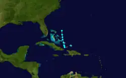 | Thirteen | October 9–20 | Category 1 hurricane | 85 (140) | 981 | Lesser Antilles, Greater Antilles (Dominican Republic and Cuba), Gulf Coast of the United States (Louisiana), Southeastern United States | >$10,000 | None | [17] | ||