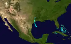 The first cyclone of the season existed by 00:00 UTC on June 16 in the northwestern Gulf of Mexico, based on Brownsville, Texas, recording sustained winds of 28 mph (45 km/h).[7] Due to sparse observations, the system may have developed prior to this time, but was not detected. Centered about 200 mi (320 km) southeast of Galveston Island on July 16, the cyclone moved west-northwestward and quickly strengthened, becoming a hurricane several hours later. It peaked with sustained winds of 80 mph (130 km/h) early on June 17, and made landfall southwest of Bay City, Texas, over the eastern end of East Matagorda Bay around 06:00 UTC. Turning to the northwest after landfall, it quickly degenerated into a tropical storm, gradually turning northward over time. The cyclone weakened into a tropical depression around 06:00 UTC, and lost its identity just 12 hours later near Waco.[5] Climate researcher Michael Chenoweth proposed that this storm approached Texas on a north-northwestward course and made landfall as a tropical storm, without ever attaining hurricane status.[4]