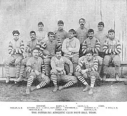 The team's November 12 game against the Allegheny Athletic Association, for which Pudge Heffelfinger received $500 to play for Allegheny, marks the first recorded appearance of a professional player in American football.[1]