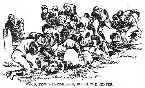 The game was played on the Alumni Athletic Field at the Georgia campus and began at 3:15 p.m.. Only thirty minute halves were used.[8] The first half showed a significant size advantage for Georgia Tech and the Techs ran nearly every play through the center. Wood, playing left guard, was described as being able to "handle his opposing guard, who was a much lighter man, almost as if he were a child". Georgia's captain, George Butler, would later praise Wood's play in saying that he was spectacular in every respect and that Georgia's defense could make no gains on Wood's part of the line. Butler said that "my guard was so humiliated at his inability to stop Wood that I could never get him to don a uniform again; he quit football thereafter and declined to have his picture taken with the squad."[3] Tech scored three touchdowns in the first half and Georgia was held scoreless.[14] Georgia played much better in the second half and used a "turtleback" formation, which Georgia Tech had not previously seen and was unable to stop it effectively. Nevertheless, Georgia Tech had increased its lead to 22-0 before Georgia scored a touchdown. The game ended with a score of 28–6.[8][14]