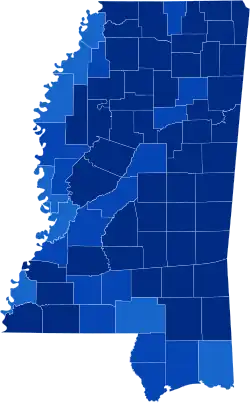 With black disfranchisement virtually complete due to onerous poll taxes and literacy tests, Mississippi would begin seven decades as a one-party Democratic state, as the state completely lacked areas of upland or German refugee whites opposed to secession.[1] No Republican would serve in the state legislature between 1902 and the 1960s, and only once until 1950 – when Herbert Hoover won riding on anti-Catholic and Prohibitionist sentiment the Pine Belt counties of Pearl River, Stone[a] and George[b] in 1928 – would the state Democratic nominee[c] lose any Mississippi counties in any Presidential election.[2]