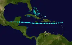 Ships first indicated the presence of a tropical storm southwest of Cabo Verde on September 5.[10] The system moved generally westward and intensified into a hurricane late the next day. Early on September 11, the storm peaked as a strong Category 2 hurricane with maximum sustained winds of 110 mph (175 km/h) as it began passing through the Lesser Antilles, first near Barbados and then between Saint Lucia and Saint Vincent several hours later. Thereafter, the hurricane turned northwestward and entered the Caribbean. Around 18:00 UTC on September 12, the cyclone passed just west of Anguilla while traversing the Anegada Passage and re-emerged into the Atlantic. The storm continued northwestward until curving northeastward on September 17. Late on September 19, the system transitioned into an extratropical cyclone about 95 mi (155 km) of the eastern tip of Nova Scotia. The remnants crossed Newfoundland before dissipating over the Labrador Sea on the following day.[3]