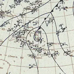 A tropical depression formed about 50 mi (80 km) south of Trinidad, Cuba, on October 15. The depression moved northeastward without strengthening and struck Sancti Spíritus Province shortly thereafter.[4] A few cities observed rainfall.[14] Upon reaching the southwestern Atlantic Ocean late on October 15, the depression intensified into a tropical storm. Further deepening occurred as the storm moved northeastward into the Bahamas, where it made landfall on or brushed Long Island, Rum Cay, and San Salvador Island on October 16. That day around 12:00 UTC, the cyclone peaked with maximum sustained winds of 60 mph (95 km/h). Thereafter, the system began weakening and losing tropical characteristics, transitioning into an extratropical cyclone early on October 18 while located about 330 mi (530 km) south-southwest of Bermuda. Several hours later, the remnants dissipated.[4]