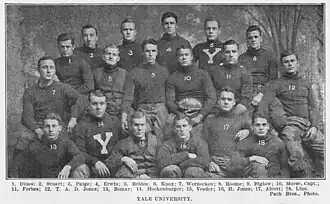 The 1906 Yale Bulldogs football team was an American football team that represented Yale University as an independent during the 1906 college football season. The team compiled a 9–0–1 record, shut out nine of ten opponents, and outscored all opponents by a total of 144 to 7.[1] Four Yale players were selected as consensus All-Americans, and the team was selected by multiple selectors as the national champion for 1906.