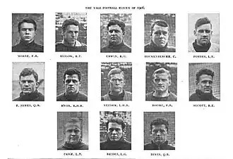 Four Yale players were among the eleven selected as consensus first-team players on the 1906 All-America team.[19] Yale's four consensus All Americans were: halfback William F. Knox; fullback Paul Veeder; end Robert Forbes; and tackle Lucius Horatio Biglow. Five other Yale players receiving All-American honors were quarterback Tad Jones, fullback Samuel F. B. Morse, center Clarence Hockenberger, end Clarence Alcott, and Arthur Brides.[20][21][22][23]