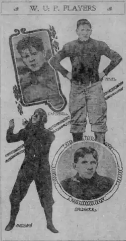 The WUP starting lineup for the game against State was Artur Solter (left end), Frank Van Doren (left tackle), Samuel Elliott (left guard), John Turner (center), John Shuman (right guard), Calvin Marshall (right tackle), Homer Roe (right end), Karl Swenson (quarterback), Quince Banbury (left halfback), Fred Klawuhn (right halfback) and Omar Mehl (fullback). Substitutions made during the game were: Waldy Zieg replaced Samuel Elliott at left guard; Richard Hoblitzell replaced Homer Roe at right end; Joe Campbell replaced Omar Mehl at fullback; and Edgar Chatham replaced Quince Banbury at left halfback. The game consisted of two thirty-five minute halves. Numbers were worn on the jerseys as seen on the photo on the left.[10]