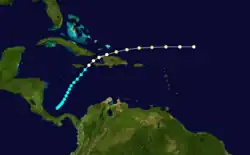 Early on November 13, the hurricane further intensified to the equivalent of a Category 2 system and attained peak winds of 105 mph (170 km/h).[2] No barometric pressure was recorded at the time of peak intensity since it occurred over water and away from any ships.[3] In an initial analysis of the storm made by meteorologist José Fernández Partagás in 1999, he wrote that at the storm's peak, it was a strong tropical storm, not a hurricane. In a report, it was stated that "It was a difficult case for the author [Partagás] to decide whether or not to upgrade to a hurricane".[4] It was not until the Atlantic hurricane database re-analysis reached 1909 in February 2004 that the storm was designated as a hurricane.[2][5] By November 14, the storm began to weaken as it turned nearly due east.[2] Later that day, it quickly transitioned into an extratropical cyclone before being absorbed by a frontal system northeast of the Lesser Antilles.[1][2]