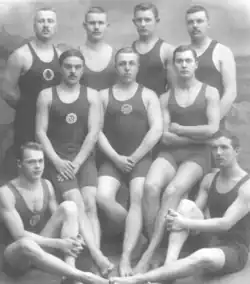 Championship-winning water polo team of Helsingfors Simsällskap in 1910 with two reserve players