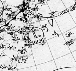 A tropical depression formed about 140 mi (230 km) east-southeast of Ocean City, Maryland, early on September 2. The depression drifted southward and reached tropical storm intensity later that day.[5] Based on observations from ships on September 3, the cyclone peaked with maximum sustained winds of 50 mph (85 km/h) and a minimum barometric pressure of 1,007 mbar (29.7 inHg).[4] The storm then began moving southwestward at a faster pace. Late on September 5, the cyclone weakened to a tropical depression and curved west-southwestward. Shortly after 06:00 UTC on September 6, the system made landfall near Midway, Georgia, with winds of 35 mph (55 km/h). About 12 hours later, the depression dissipated over southwest Georgia.[5] The strongest wind speed associated with the storm was 37 mph (60 km/h) in Charleston, South Carolina.[4]