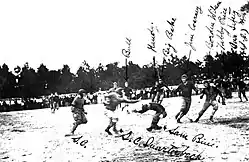 The first game was held on Christmas Day, and the Gators defeated the Vedado Athletic Club, 28–0.[2] The second game, which pitted the Gators against the Cuban Athletic Club of Havana, ended abruptly when Coach Pyle realized that the officials were running the game according to football's old rules and that the head referee was the former coach of his opponent.[26] Pyle pulled his players off the field during the first quarter and was arrested for violating a Cuban law prohibiting a game's suspension after spectators' money had been collected.[27] A trial was scheduled and Pyle was released on bail, at which point he, the team, and the Gators' entire traveling party quickly boarded a steamship for Tampa, an escape which caused the coach to be branded a "fugitive from justice" by Cuban authorities.[26]