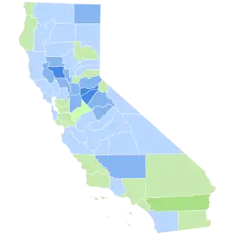 Although Wilson narrowly failed to win the state, he did become the first Democrat to carry Napa, Solano[c] and Marin Counties since James Buchanan in 1856, the first to carry San Mateo and Sierra County since Stephen A. Douglas in 1860, the first to win San Diego County since 1868, the first to ever carry Ventura County, which had been created in 1872, and the first to carry Calaveras County and Sutter County since 1876.[4] Since this election, Solano County has voted Democratic in all but six Republican landslide elections of 1920, 1924, 1928, 1972, 1980 and 1984.