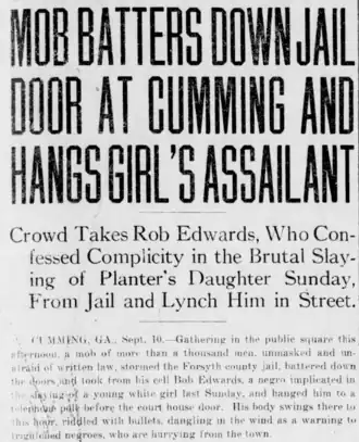 Rob Edwards was arrested the next day as a suspect in Crow's attack and was taken to the county jail in Cumming.[17] Sheriff Reid then left, leaving his deputy to protect the jail and its prisoner.[17] Later that day, a lynch mob attacked the county jail; some men gained entry, dragged Edwards from his cell, and hanged him from a telephone pole in the town square;[17] he may have been shot to death before being hanged.[18] The Atlanta Georgian reported that "the corpse was mangled into something hardly resembling a human form."[17]